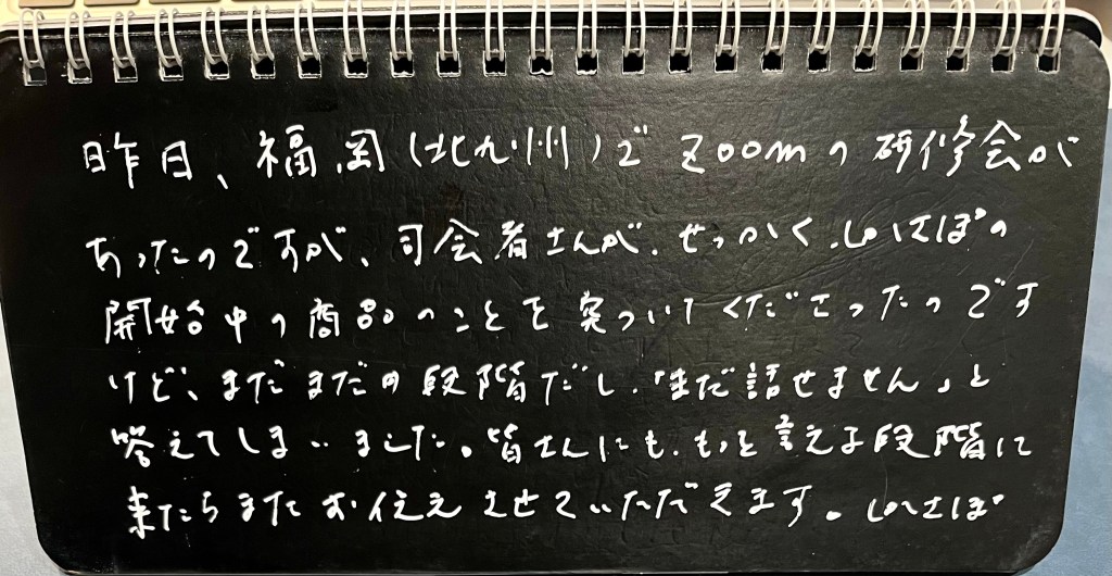 昨日、福岡(北九州市)でzoom研修があったのですが、司会者さんが、折角しかさぽの開発中の商品のことを突いてくださったのですが、まだまだの段階だし、「まだ話せません」と答えてしまいました。