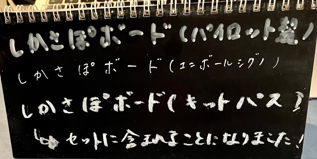 しかさぽボードのセット内容の白ペンが変わりまして、キットパスになったのですが、これまでの白ペン「パイロット製」と「三菱ユニボールシグノ」、「キットパス」の書き比べをしてみました。