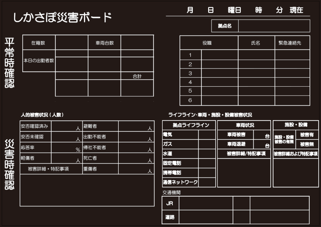 今度の商品は、学校、自治体、病院、施設、避難所、オフィス等向けの商品で、名前を「しかさぽ災害ボード」と申します。