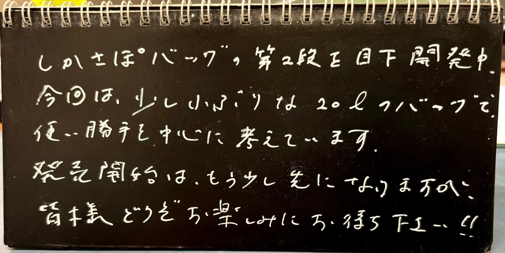 現在のバッグは容量が30Lと成人男性が持つ分にはピッタリでしたが、女性にはややサイズが大きめ。そこで次回は、やや小ぶりな20Lで検討。目下開発中です。