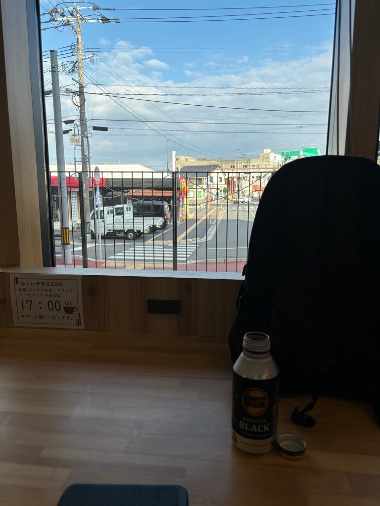 遠賀のケース宅に行く前は、おんがみらいテラスでコーヒーを飲む。定番である。