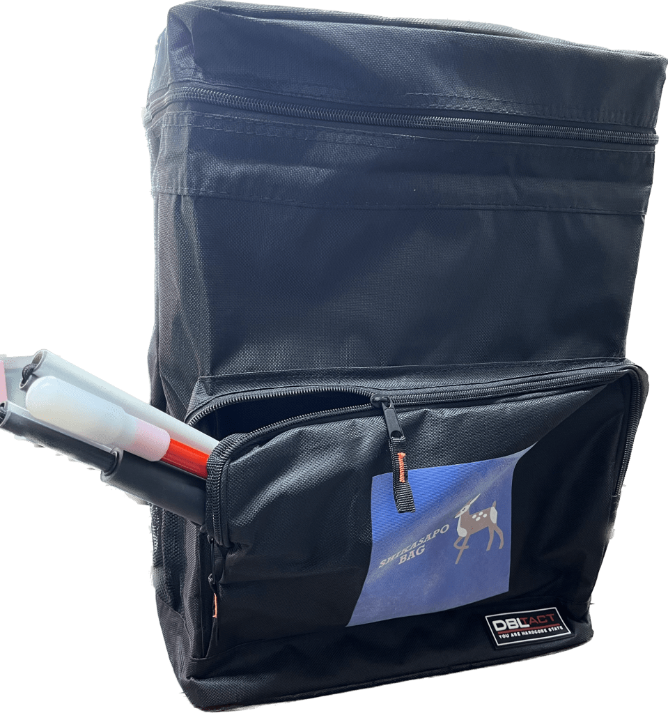 ③しかさぽバッグ/2号は、ロービジョンに限らず全視覚障害者向けの商品で、しかさぽバッグが30L、2号が20Lの容量があります。それぞれ背面に中央部にイラストのある反射材と蓄光材が転写されており、夕方及び夜間の移動の際など、車のヘッドライトでドライバーが視認できます。内部にビニール袋を入れれば水などを背負って運べるリュックにもなります。
