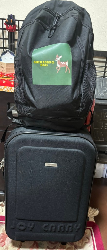 下のキャリーが商売道具で、上のバッグが一泊の荷物。一泊の荷物なので大したことはないが、それでもそれなりに。