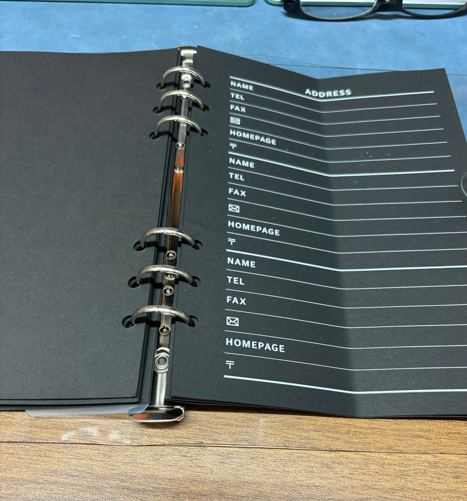 穴あけは専用パンチを用意した。開けて、揃えて、黒の無地のページを追加して、こちらで用意したバインダーに綴じる。ここまでだ。