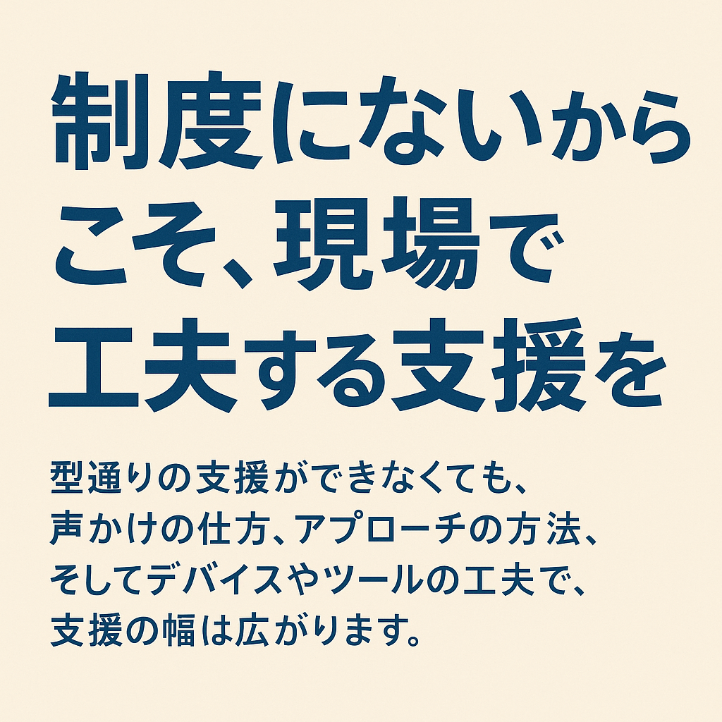 けれど、支援の現場こそ柔軟さが必要です。制度にないからこそ、目の前の利用者のために工夫する。誰かが「こうしてみたら?」と提案し、仲間と試す。そうした「型破りの工夫」が本当の支援につながります。