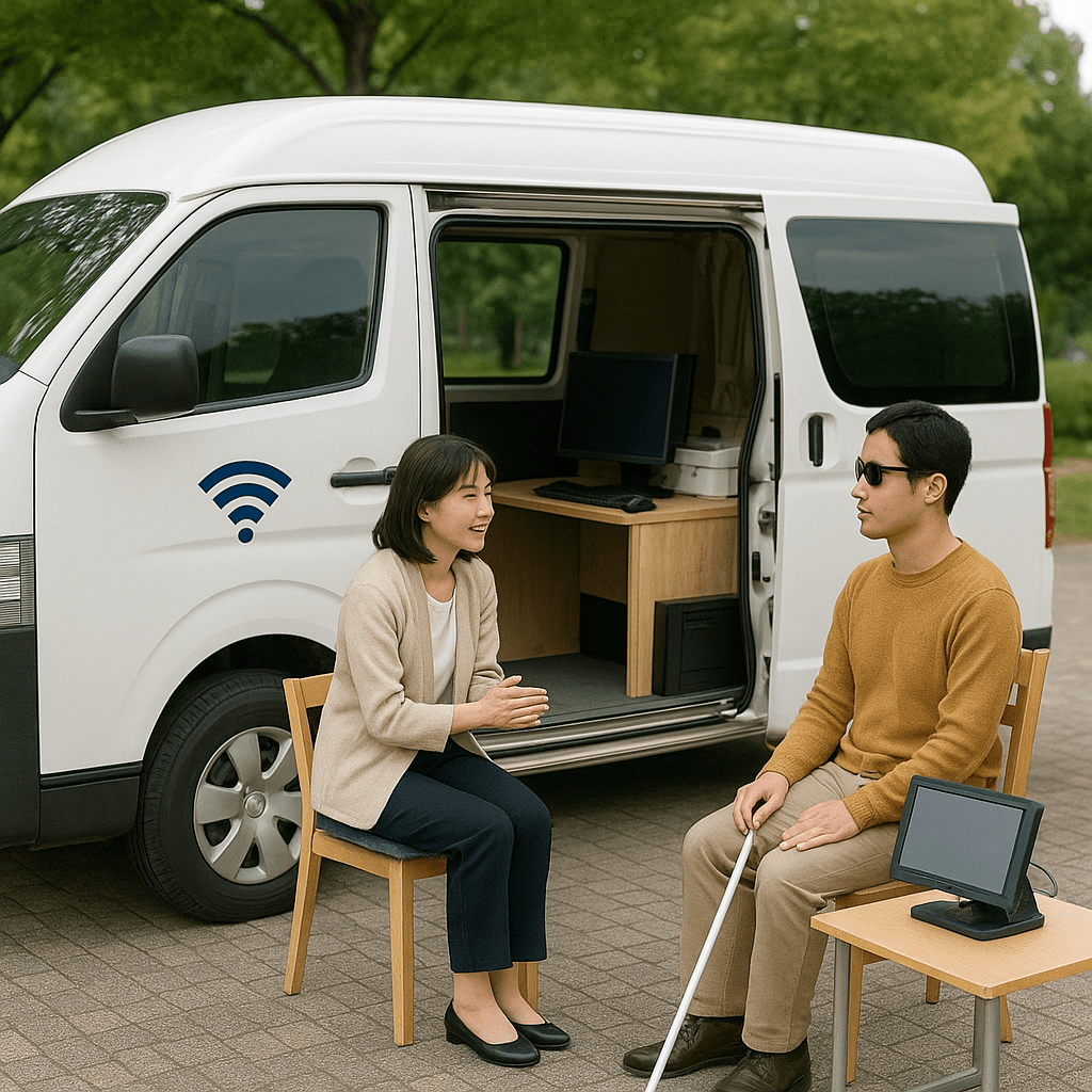 この壁をやさしく崩していく鍵となるのが、移動オフィスカーです。市役所前やショッピングモール、道の駅など、日常の生活圏に車ごと支援を届けることで、視覚障害者支援の現場を“まちなか”に可視化できます。
