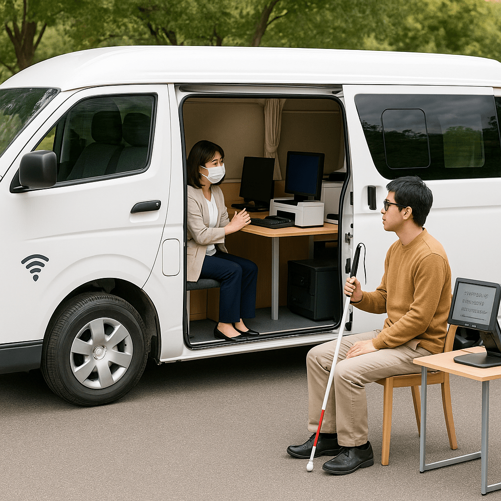 この移動オフィスカーは、リハビリテーション専門職が機材と情報を積み込み、直接利用者のもとへ赴く“走る支援拠点”です。Wi-Fiや電源、点字プリンタ、拡大読書器、デジタル機器などを搭載すれば、その場で評価・訓練・情報提供が可能になります。