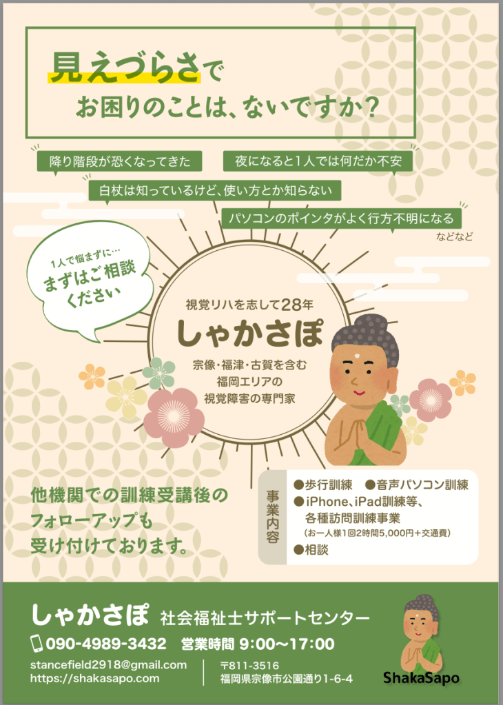しゃかさぽの新しいチラシが完成しました。しかさぽ時代から受け継いできた「見えにくさに寄り添う」という思いはそのままに、今回はさらに神々しさと温かみを感じられるデザインに仕上がっています。やわらかな色使いと、穏やかなほほえみのイラストが目を引き、手に取った瞬間に安心感を与えてくれる構成です。内容面でも、「降り階段が怖くなってきた」「夜になると一人では不安」「白杖は知っているけど使い方が分からない」「パソコンのポインタが行方不明になる」など、見えづらさにまつわる身近な困りごとを丁寧に拾い上げています。「まずはご相談ください」という呼びかけが、迷っている方の背中をそっと押してくれるはずです。