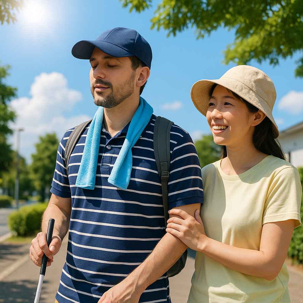 次に暑さ対策。ネッククーラーや冷感タオルなどの冷却グッズを活用し、休憩場所やコンビニ・カフェといった「涼める拠点」をルートに組み込みます。また、水分補給のタイミングもあらかじめ練習に取り入れ、立ち止まって給水する流れを習慣づけておくと安心です。