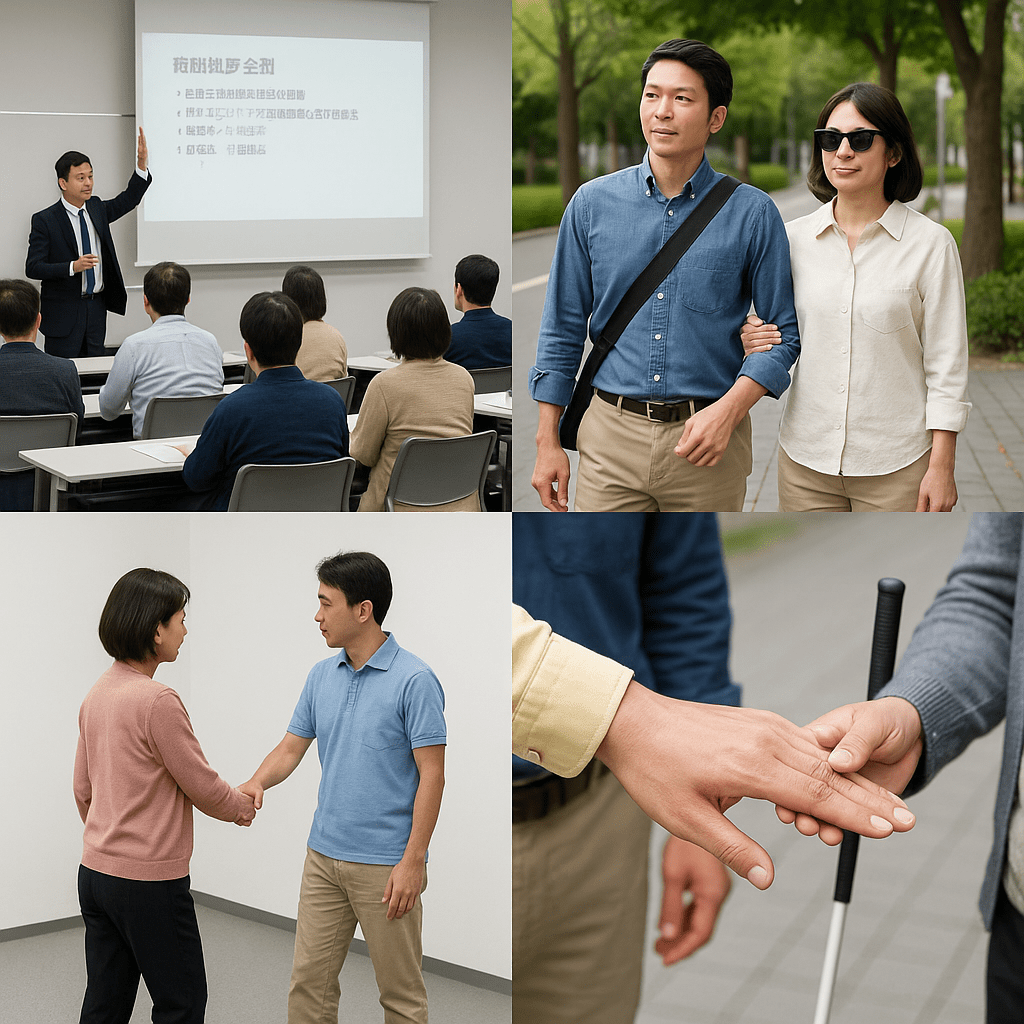 最後に実技として「手引き」の多様性が示されました。誘導の基本原則は「安全」「効率性」「自然さ」「双方のやりやすさ」の4つ。白杖の携帯やエスカレーターでの対応、手の甲を使った位置の伝え方など、利用者の選択を尊重する工夫が数多く紹介されました。