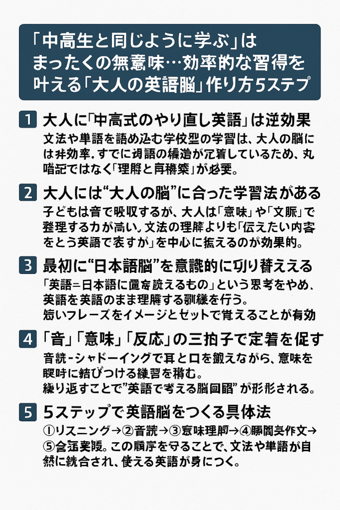 おすすめは、①リスニング→②音読→③意味理解→④瞬間英作文→⑤会話実践の5ステップ。この順番を守ることで、文法も単語も“使える英語”として脳に定着します。大人には大人の学び方があります。効率と実感を両立する「英語脳」を育てていきましょう。