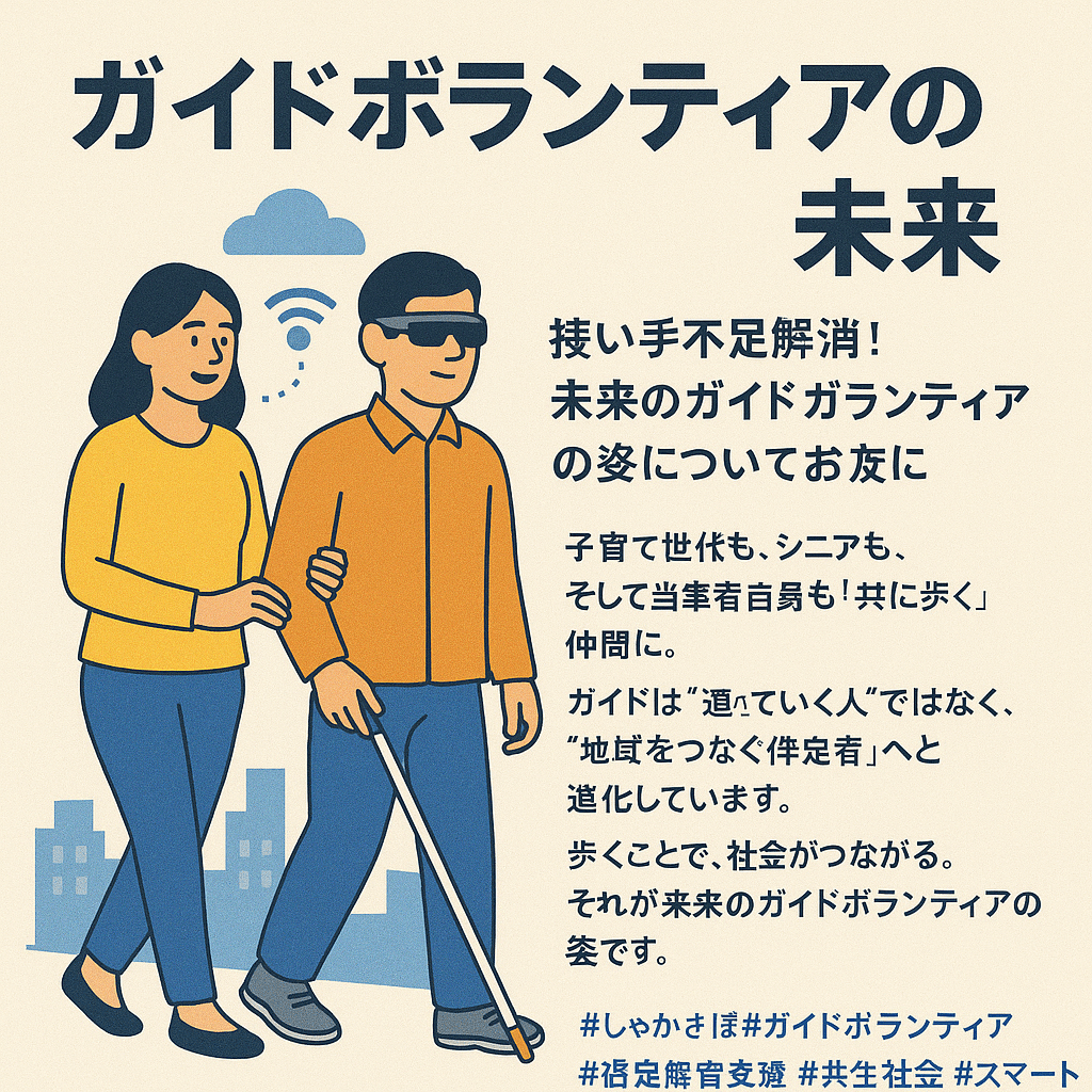 まず、技術の進歩。スマートグラスやAIナビゲーションが、歩行ルートや障害物を音声で伝え、ガイド経験の浅い人でも安心して支援できるようになります。さらに、オンライン研修やVR体験で、誰でも自宅からガイド技術を学べる時代に。