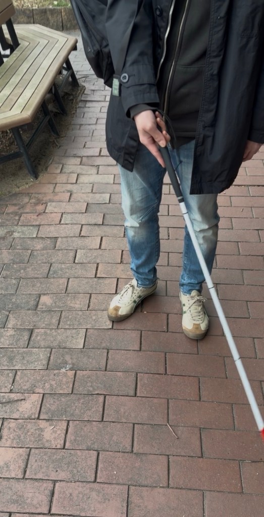 今回は無理に新しい課題を進めるのではなく、まずは復習から入りました。基本姿勢、白杖操作、環境確認といった基礎を一つずつ確認し、その後、直線歩行の安定性をチェック。雨天で視覚情報が減り、路面の音や足裏感覚も変わる状況でしたが、落ち着いて対応できており、これまでの訓練の積み重ねを感じました。
