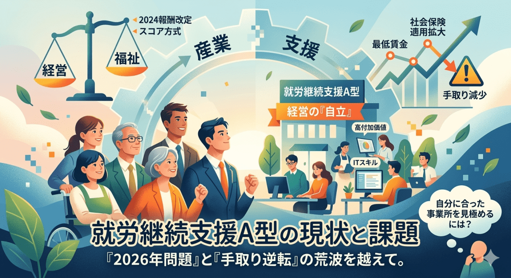 A型事業所は、最低賃金が保証される貴重な就労の場です。しかし今、全国で閉鎖やB型への移行が相次いでいます。背景にあるのは、2024年度の報酬改定による**「スコア方式」の厳格化**。さらに2026年10月に控える**「社会保険の適用拡大」**が、経営と利用者の手取りの両面に重くのしかかっています。